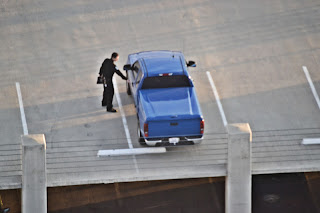 While looking out our windows, we saw this security guard. We couldnt figure out what he was doing. I got out my long lens and watched him. He was wandering around his car and then he kept walking around the car and then he locked the car. And then he wanted to get back in the car so he kept trying all the doors over and over and over and over. Weird.